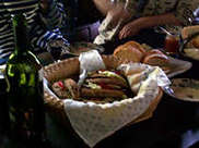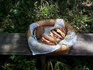 レーズン.クルミは細かくきざみ室温に戻したクリームチーズ に混ぜ入れる。これをパンにぬり入れ、最後にバジルを1、2枚はさむ。