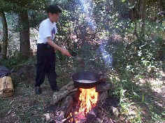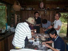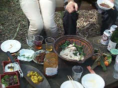 ![]() ![]() ![]() 久し振りの川内シェフの登場です。最近お付き合いが始まった川内さんの友人の方々と、企画室のメンバーで、テールスープのラーメンと水餃子の会をしようということになり、集ったメンバー13名。清々しい緑の中、のんびりとした気持ちのいい一日を楽しむことが出来ました。 韓国風テールスープのラーメンは川内さんがスープを私が麺を担当。石を組んだ竈に薪をドンドンくべて、グツグツ煮えてる大きな鉄鍋で、ラーメンを茹でてくれているのが安部さんです。 写真左上はみんなで餃子の皮を作って、具を包んでいるところ。右下はたらふく食べてのんびりとしたひと時。これからもちょいちょい川内シェフの食事会を開いてもらいたいものです。 |
